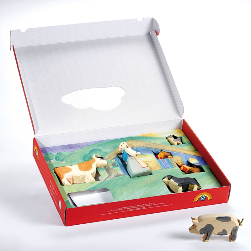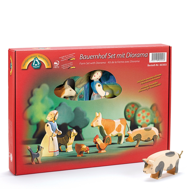 Die Figuren des Bauernhofsets zeichnen sich, wie alle Ostheimer-Produkte, durch eine herausragende Qualität und Einmaligkeit in der Gestaltung aus. Vom ersten Entwurf bis zur fertigen Figur ist ein hohes Maß an Fingerspitzengefühl gefordert, denn die Herstellung dieser handgestalteten Figuren setzt Sorgsamkeit und Detailgenauigkeit voraus. Zudem legt Ostheimer großen Wert auf biologische Öle und hochwertige transparente Lasurfarben, die die Holzstruktur durchschimmern lassen. Und das zeichnet sich aus: Die Figuren im Ostheimer Bauernhof Set werden so zu einzigartigen Produkten mit individueller Prägung. Auch bei der Wahl der Rohstoffe ist Ostheimer sehr gewissenhaft und bezieht Hölzer aus europäischer nachhaltiger Forstwirtschaft. Ostheimer-Spielfiguren sind also nicht nur für Ihre Kinder eine liebevollere Alternative zu maschinell hergestellten Spielfiguren, sondern auch für die Umwelt eine gute Sache.