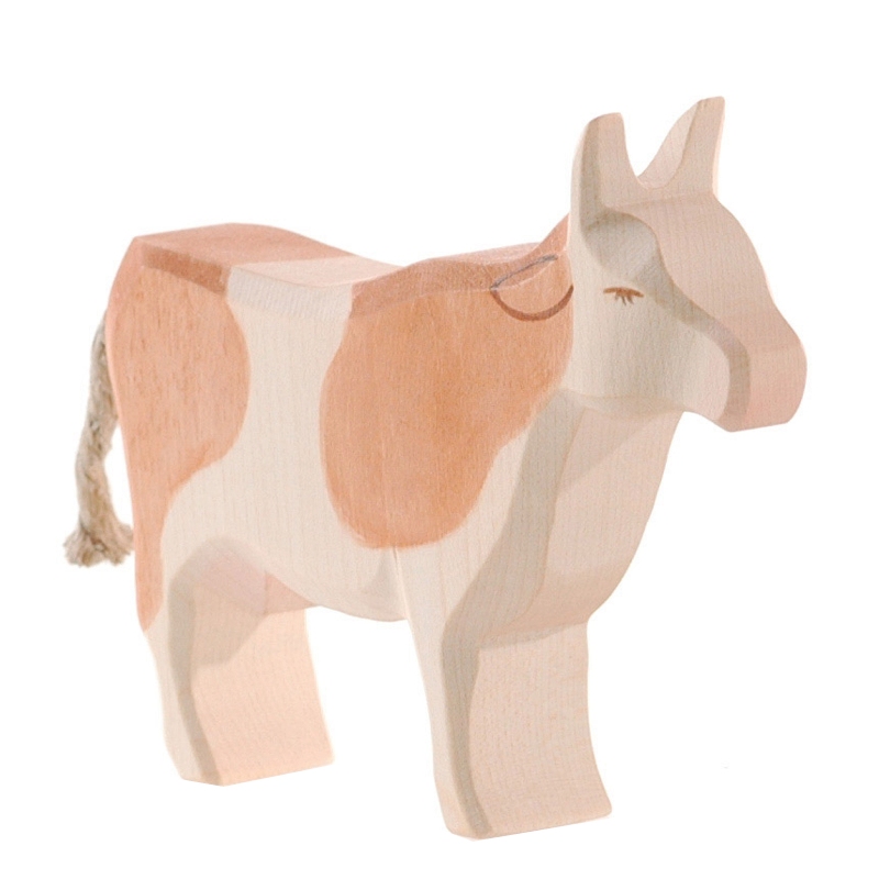 Kühe sind auf einem Bauernhof nicht wegzudenken. Friedlich stehen sie auf der Weide und fressen Gras und Kräuter. Da die Kuh ein Wiederkäuer ist schluckt sie das Futter sofort herunter, käut es wieder und verdaut es in mehreren Mägen. Meist hält der Mensch Kühe, um ihre Milch zu nutzen. In manchen Teilen der Welt werden Rinder aber auch als Zugtiere eingesetzt, denn sie sind sehr stark. So wird eine ausgewachsene Kuh bis zu 700 Kg schwer. Auf einem klassischen Holztiere-Bauernhof sorgt die Ostheimer Kuh für viel Spielspaß: Mal frisst sie friedlich Gras auf der Weide und mal büchst sie aus und muss wieder eingefangen werden.